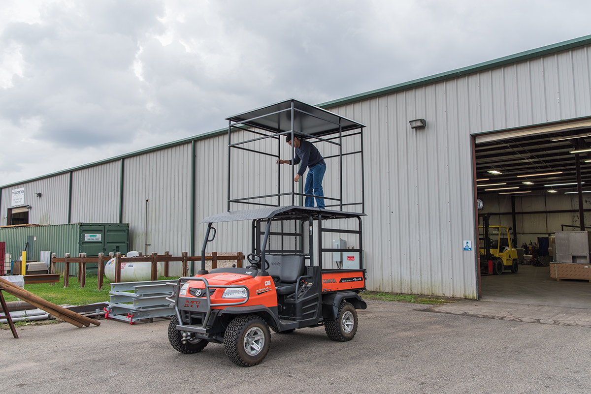 The main purpose for it was to provide a way for our client to elevate himself out of sight and move to different areas by driving the Kubota to a different location. If a buck does see you, the game is up. The stand, however, gives you a significant advantage. Allowing you to prepare, draw and make the shot all without a buck ever knowing what happened.